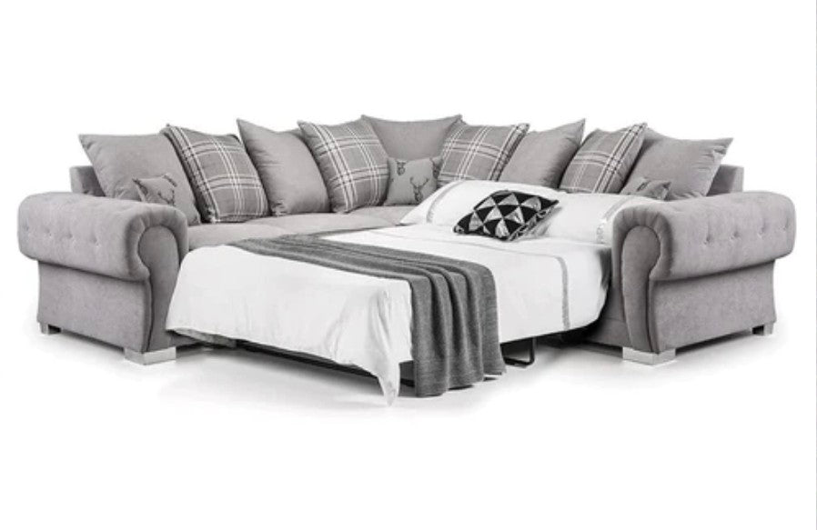 Verona Kensington Fabric Corner Sofa Bed , Available in Grey, Mink, Black colour .The Premium grey Kensington fabric used in this corner sofa bed is a type of durable fabric that is known for its softness and comfort. The fabric is made from a blend of materials, which makes it resistant to wear and tear, as well as stains and spills. The scatter cushions that come with the sofa bed are designed to add an extra layer of comfort and support, making it even more comfortable to sit or sleep on.