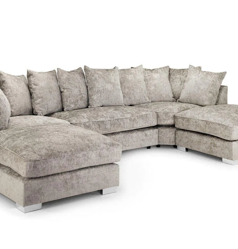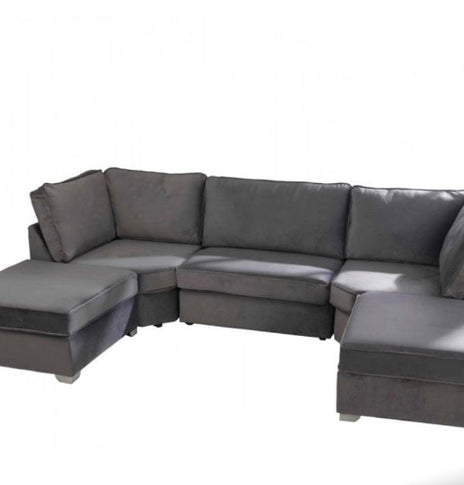 Large Full back design, Also Available in Scatter Cushions Foam-filled seating cushions Chunky box design Sturdy, reinforced, glued frame supportOne year warranty Beautiful plush Velvet U shape sofa expresses a contemporary and luxurious design finish...